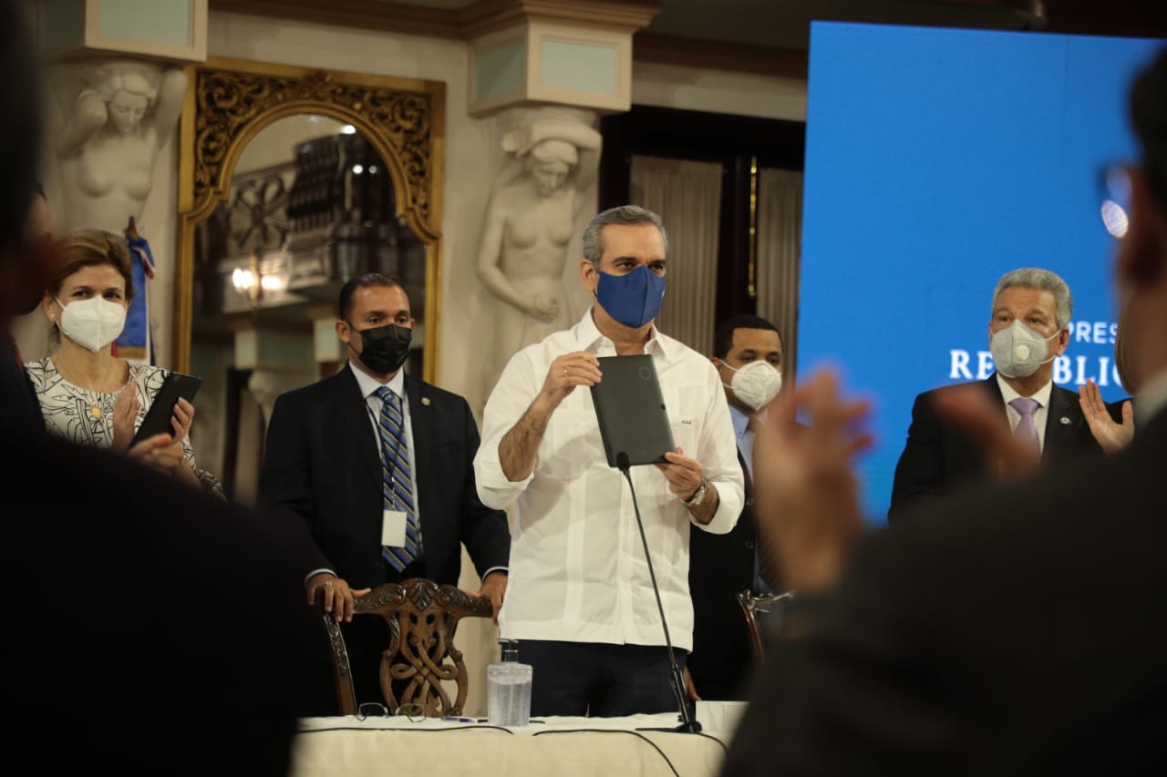 El presidente Luis Abinader encabezó el acto junto a la vicepresidenta, Raquel Peña, mediante el cual el Estado dominicano, a través del Parque Cibernético de Santo Domingo, firmó el “Programa Fabricación en RD: servicios postventa de dispositivos electrónicos para el sector educación”.